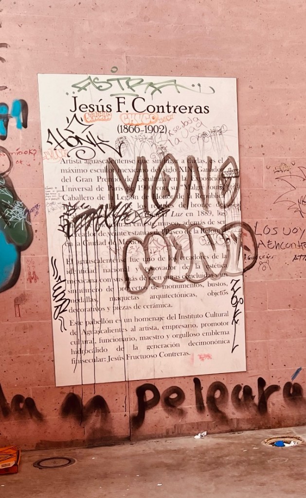 Hoy no tiene nombre, tampoco propósito, mas la obra arquitectónica que se erigió para celebrar el arte de Jesús F. Contreras (1866-1902), ha pasado por distintos calificativos: mausoleo, primero; pabellón, después. Lo único cierto es que, al lado del Museo de Aguascalientes, la administración estatal 2010–2016, en el último año de su gobierno, con motivo del sesquicentenario del artista aguascalentense, decidió hacerle un homenaje: construir un mausoleo, cuya intención central era que resguardara las cenizas de Contreras, que en ese momento se encontraban en Ciudad de México. La obra se construyó y las cenizas se trajeron, pero las buenas intenciones no siempre son aliadas de lo perdurable: ahora, el espacio no tiene espíritu y las cenizas descansan en otro sitio. Más aún: desde 2023, aquel reconocimiento ha mutado en desaire.